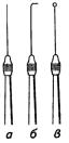 Рис.3. Бактеріологічні голка (а), гачок (б) та петля (в).