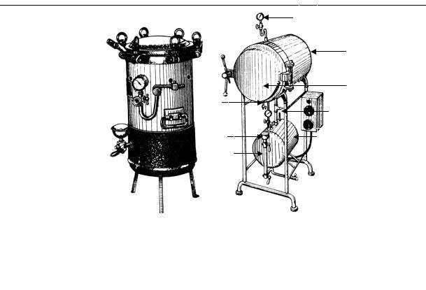 в) стерилізація насиченою парою (вологим жаром) під тиском (автоклавування). Це найбільш надійний та поширений спосіб стерилізації. Проводять за допомогою спеціальних пристроїв – автоклавів (рис. 5), металевих резервуарів, що герметично закриваються і здатні витримувати високий тиск.