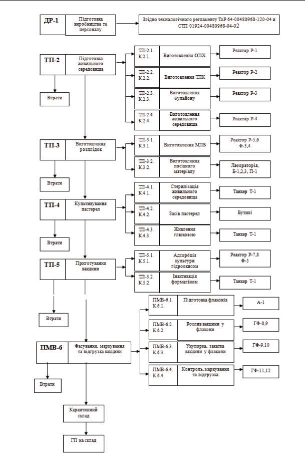 3)Технологічна схема виробництва у вигляді блок-схем, відображає послідовність виконання робіт у виробництві з розділенням їх по стадіям та операціям технологічного процесу (рис.48). Також вказуються основні матеріальні потоки (надходження сировини і проміжні продукти, місця утворення відходів стічних вод, викидів у атмосферу системами очистки та утилізації). Кожна стадія і операція нумеруються: ТП-1, ТП-2. В цьому ж розділі є дані про підготовку культури мікроорганізмів-продуцентів.