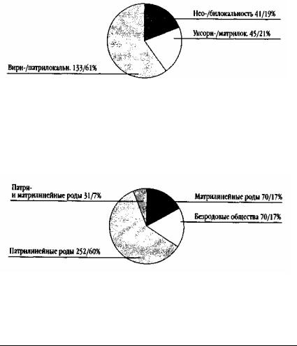 В самом деле, из классического эволюционистского представления об однолинейности социальной эволюции и наличии функциональной зависимости между всеми ее основными переменными вытекает, например, следующее. «Матриархальные» (ма-трилинейные) общества, согласно классическому эволюционизму, предшествовали «патриархальным» (патрилинейным). Присваивающее хозяйство (охота, собирательство и рыболовство) исторически предшествовало производящему хозяйству (а с этим теперь уж точно никто спорить не будет). Но из этого, как минимум, вытекает, что в обществах охотников-собирателей (т.е. обществах, наиболее архаичных изо всех описанных этнографами) матрилинейные матрилокальные культуры должны если и не абсолютно преобладать, то встречаться по крайней мере заметно чаще, чем среди примитивных земледельцев. Однако собранные этнографами эмпирические данные абсолютно противоречили этим выводам, с неизбежностью вытекавшим из классической эволюционистской теории. Выяснилось, что среди описанных этнографами обществ охотников-собирателей матрилинейные матрилокальные культуры составляют ничтожное меньшинство. Преобладают же среди них безродовые общества с патрилокальным, амбилокальным или неолокальным брачным поселением, и даже патрилинейные родовые группы встречаются много чаще матрилинейных (см. диагр. 1 и 2|5<, построенные по данным Этнографического атласа Дж. П.