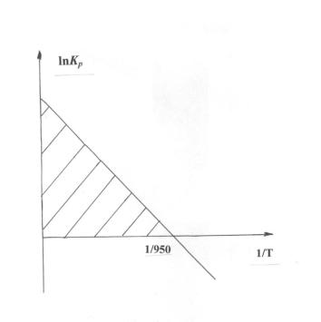 Термодинамический анализ реакции (1) с учетом положительных значений ∆Н и ∆S (рис. 1) позволяет заключить, что температура процесса должна быть выше 680 0С (950 К) (точка пересечения графика с осью Х), для обеспечения условия Кр > 1.