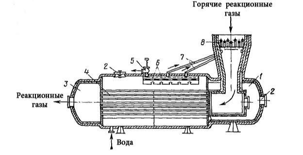Горячие реакционные газы поступают в испарительные трубки 4 котла-утилизатора, в межтрубное пространство которого поступает питательная вода. Образующийся пар по трубкам 7 поступает в пароперегреватель 8 и оттуда направляется потребителю.