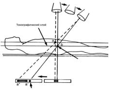 Схема линейной томографии. Выделение продольного слоя заданной толщины. Точка «a» расположена вне томографического слоя, ее изображение оказывается размазанным. Точка «b» расположена внутри слоя и полу-