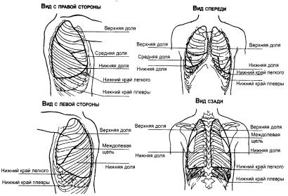 Схема границ долей лѐгких, положение нижних границ лѐгких и нижних границ плевры (М.В. Черноруцкий, 1954):