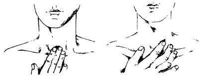 В завершение пальпации гортани и трахеи исследуется «вилочный» симптом (Г.В. Рубинштейн). II и III пальцы правой руки устанавливаются в виде вилки по разным сторонам трахеи над рукояткой грудины и оценивают ее положение. В норме трахея располагается по средине шеи. При одностороннем циррозе легкого после перенесенного туберкулеза, абсцесса, гангрены, а также