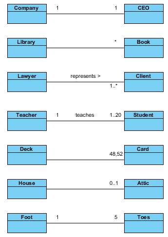 Приведите примеры (не менее трёх) обозначения множественности на диаграмме классов.