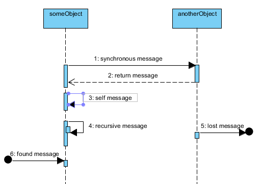 Существует также тип сообщений, которые посылаются самому себе (self-message). Это могут быть вызовы операций внутри объекта и т.д. Похожим способом отображаются рекурсивные (recursive message) сообщения.