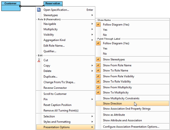 Для отображения направления связи, кликните правой кнопкой мыши по связи и выберете «Presentation Options», а затем выберите пункт «Show direction».