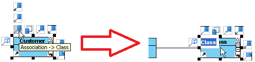 Для создания новой связи, необходимо щелкнуть по символу «Association» в меню ресурсов, которое находится рядом с каким-либо классом, и перетащить её в свободное место на диаграмме, чтобы создать новый класс, или перетащите на существующий класс для установления связи с ним. Затем, отпустите клавишу мыши для создания связи.