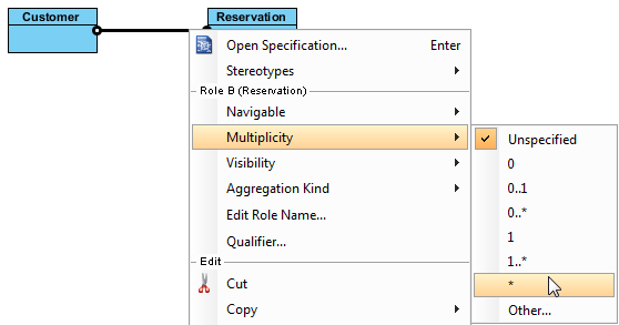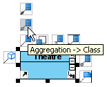 Для создания связи типа агрегация, необходимо выбрать в меню ресурсов, которое находится рядом с классом, «Aggregation Class». Чтобы установить множественность для ассоциации, необходимо щелкнуть правой кнопкой мыши у того конца связи, который требуется модифицировать. В контекстном меню кликнуть по пункту «Multiplicity», а затем выбрать требуемый вариант множественности.