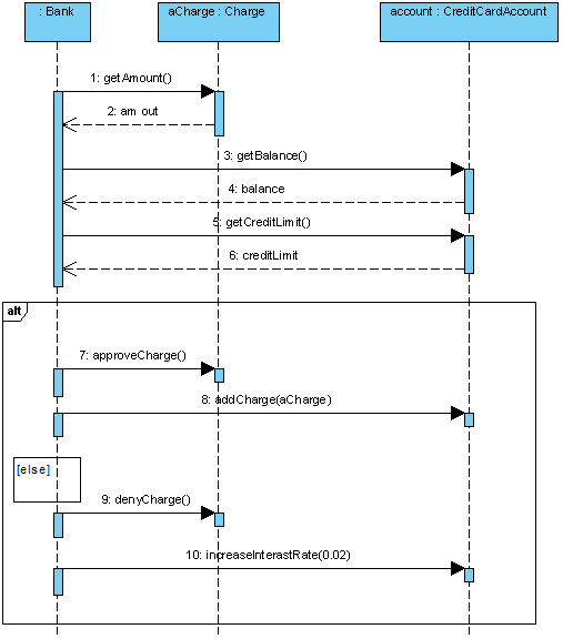 На рисунке 42 показан вариант диаграммы с альтернативным фреймом. У него есть пунктирная линия, которая разделяет те сообщения, которые будут выполняться при срабатывании условия, от тех, которые будут выполнены при возврате отрицательного результата при проверке условия.