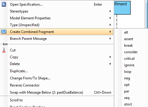 Для создания нового сообщения, необходимо выбрать один из возможных типов сообщений и провести линию между двумя объектами на диаграмме. На рисунке 36 показаны возможные типы сообщений, которые могут присутствовать на диаграмме последовательности.