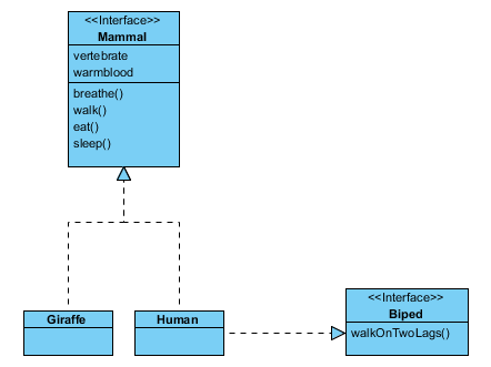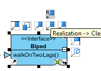 Для создания отношения типа реализация, необходимо кликнуть по пункту «Realization» в меню ресурсов, расположенном рядом с классом. Затем перетащить вновь созданную связь на пустое место диаграммы, чтобы создать новый интерфейс, или перетащить на существующий интерфейс, для соединения с ним. Далее, отпустить кнопку мыши, чтобы создать новое отношение.