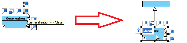 Для создания отношения типа обобщение, необходимо щелкнуть по пункту «Generalization» в меню ресурсов, расположенном рядом с классом. Затем перетащить вновь созданную связь на пустое место диаграммы, чтобы создать новый класс, или перетащить на существующий класс, для соединения с ним, потом отпустить кнопку мыши, чтобы создать новое отношение.