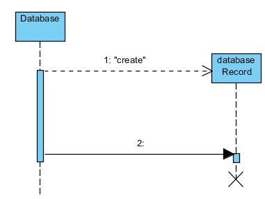 Иногда появляется необходимость обозначить объект, который создает другой объект, т.е. изначально объект-2 не существует. Для реализации такого сообщения существует два типа: сообщение создание объекта (create message) и сообщение уничтожение объекта (destroy message). Оба типа сообщения введены для определения времени жизни объекта. С их помощью можно создавать и удалять какой-либо объект.