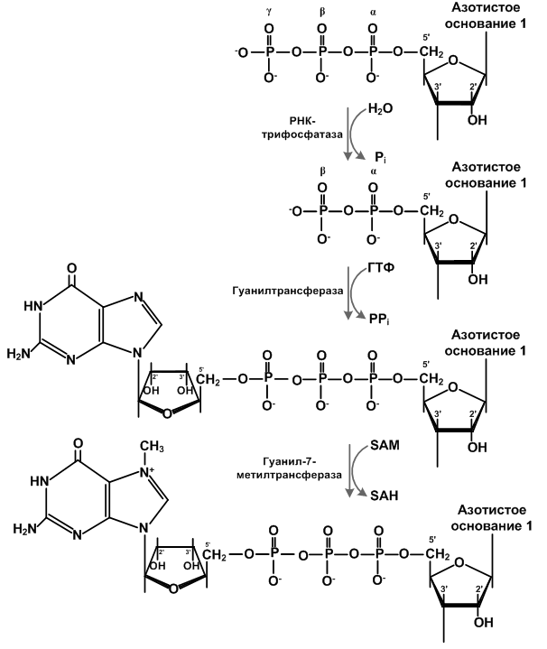 Ферменты, участвующие в кэпировании: фосфогидролаза (РНК-трифосфатаза) отщепляет один из фосфатов на 5'-конце мРНК (остаётся два); гуанилитрансфераза использует ГТФ, чтобы присоединить к 5'-концу гуанин (побочный продукт – пирофосфат); гуанин-7-метилтрансфераза метилирует остаток гуанина по 7 положению, используя SAM – S-аденозилметионин. Далее могут последовать необязательные реакции: метилирование первого и второго остатков в цепи с помощью 2'-О-метилтрансферазы.