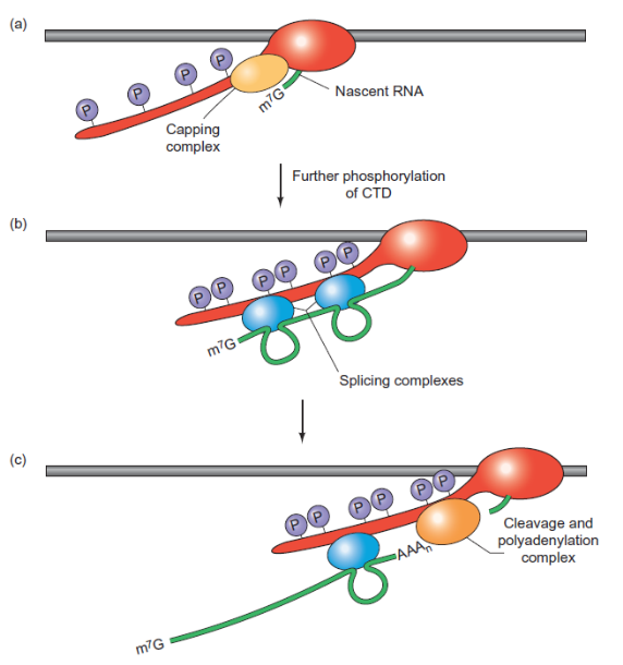 Ферменты, участвующие в «кэпировании» сплайсинге и полиаденилировании, рекрутируются фосфорилированным CTD-доменом РНК полимеразы II.