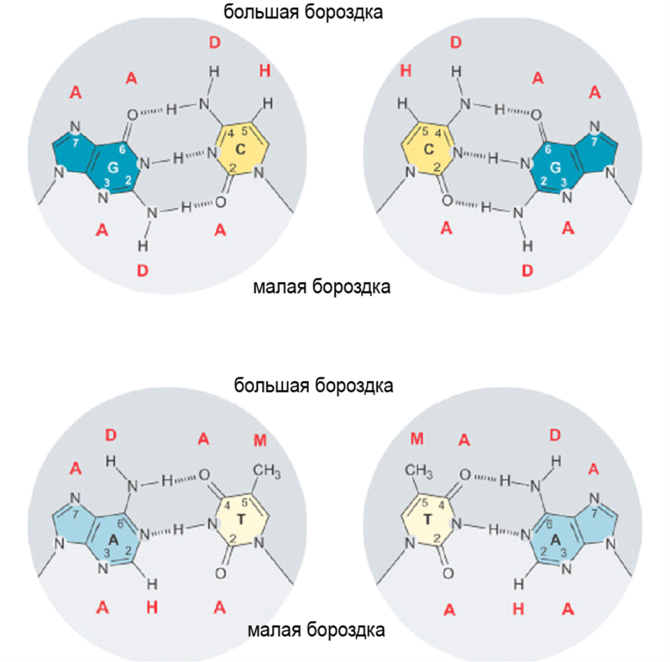 Параметры Уотсон-Криковских пар: расстояние между атомами сахара, связывающими основания (расстояние С1'-С1') в обоих случаях (AT и GC) равно 10,85 А. Угол между гликозильной связью (сахар-основание) и линией водородных связей – 51,5 град. ДНК по Уотсону-Крику – В-форма, антипараллельные цепи, есть малая и большая бороздки, шаг спирали – 33,2 А, 10 пар нуклеотидов на виток, отклонение плоскости оснований от горизонтальной равно -1,2 град. Спираль в В-форме правозакрученная. А-форма типична для двухцепочечной РНК и гибридов ДНК-РНК и имеет шаг спирали в 24,6 А, 10,7 п.н. на виток, отклонение от горизонтальной плоскости – 19 град. Спираль в А-форме правозакрученная (как и в В-форме). В Z-форме существует ДНК теломер, к примеру. В этой форме основания перевернуты, шаг спирали – 45,6 А, 12 п.н. на виток, спираль левозакрученная. Эту форму при определённых условиях может принимать ДНК с последовательностью поли dG/dC. Последовательности, способные образ. Z-форму, присутствуют в промоторах некоторых генов. Можно получить антитела к Z-форме, с помощью них было продемонстрировано, что такая форма есть в живой клетке. Во всех формах ДНК возможны разнообразные движения плоскости оснований друг относительно друга: вращения по разл. осям (z-twist, x-tilt, y-roll), смещения (z-rise, x-shift, y-slide), а также вращение оснований внтури одной пары: opening (sigma), propeller twist (omega), buckle (kappa), stogger (Sz), stretch (Sy), shear (Sx). В двухцепочечной ДНК Уотсон-Криковские пары замкнуты и не участвуют в узнавании лигандов, экспонированными остаются: в большую бороздку для пары АТ – метил тимина, кислород-4 тимина, водород аминогруппы аденина, азот-7 аденина; в малую для АТ – кислород-2 тимина, азот-3 аденина. Для ГЦ – в большую бороздку: водород цитозина, водород аминогруппы цитозина, кислород-6 и азот-7 гуанина, а в малую – кислород-2 цитозина, водород аминогруппы гуанина и азот-3 гуанина. Таким образом формируется специфичное сочетание атомов-доноров и акцепторов водородной связи (на рис. отмечены D и A, соответственно) для каждой последовательности, что и определяет взаимодействие ДНК с белками (обычно посредством остатков глутамина, серина, аспарагина, лизина и аргинина).