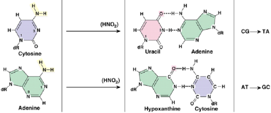 Дезаминирование аденина (превращение аденозина в инозин) – изменение смысла ряда кодонов так как A-T но I-C. Фермент adenosine deaminase acting on RNA (ADAR) (у человека три гена, кодирующих разные ADAR. Дезаминирование цитозина (превращение цитидина в уридин) фермент cytidine deaminase acting on RNA (CDAR).