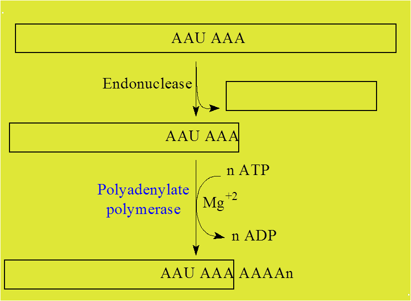 Транскрибирующая полимераза проходит через сигнал полиаденилирования, после чего РНК расщепляется и особый фермент синтезирует поли А.