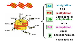 2. Химические модификации гистонов нуклеосом. Вариантные формы гистонов. Понятие о «гистоновом коде». Активный и неактивный хроматин. Механизмы репрессии генов, обусловленные деацетилированием и метилированием гистонов.