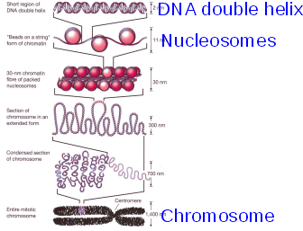 Нуклеосома является базовой структурной единицей первого уровня упаковки ДНК в хроматине. Она представляет собой белковую глобулу, или, точнее говоря некое подобие диска, на который намотан фрагмент ДНК протяженностью 146 п.н. (1,65 витка) Глобула состоит из восьми молекул гистонов: тетрамера (Н3)2-(Н4)2 и двух димеров Н2А-Н2В. Диаметр глобулы-диска составляет ~11 нм, а высота - ~ 5,7 нм.