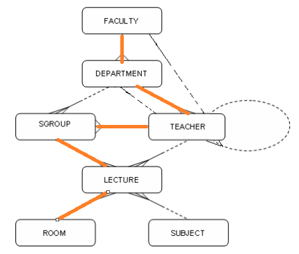 FROM Faculty f, Department d, Teacher t, Sgroup g, Lecture l, Room r