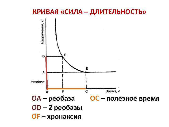 Кривая «сила-длительность» показывает соотношение между временем действия раздражителя и его амплитудой. На кривой видно, что уменьшение значения тока ниже определенной критической величины не приводит к возбуждению ткани независимо от продолжительности времени, в течение которого действует этот раздражитель.