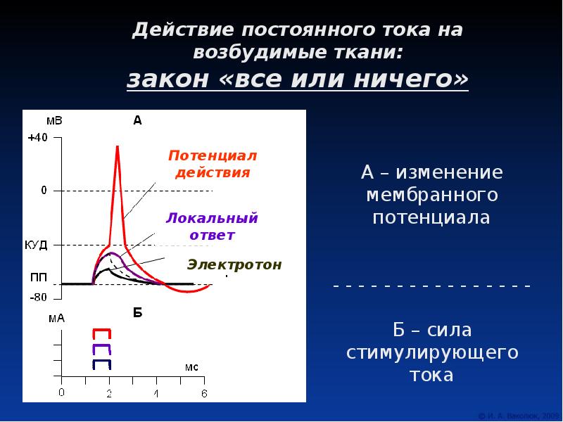 Иллюстрацией сказанному служит реакция возбудимой мембраны на пропускание через нее слабого постоянного электрического тока. Под катодом развивается деполяризация, а под анодом — гиперполяризация. Гиперполяризационные сдвиги мембранного потенциала равны по абсолютной величине. Они тем больше, чем сильнее пропускаемый ток. Однако градуальность деполяризационных ответов под катодом свойственна только подпороговым электрическим стимулам, не приводящим к возбуждению. Не вызывая возбуждения, подпороговый электрический ток изменяет возбудимость возбудимой мембраны. Изменения возбудимости под действием подпорогового электрического тока - электротонические явления.