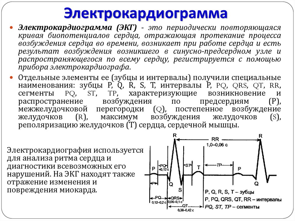 Электрокардиограмма (ЭКГ) - запись суммарного электрического потенциала, появившегося при возбуждении множества миокардиальных клеток, метод исследования - электрокардиография.