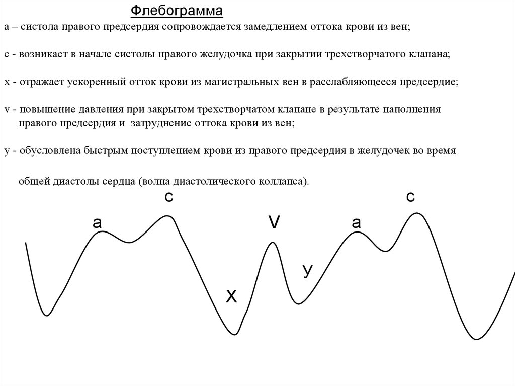 В мелких и средних венах пульсовые колебания давления отсутствуют. Пульсовые колебания возникают в венах, расположенных вблизи сердца. Методика графической регистрации венного пульса - флебография. Центральный венозный пульс регистрируют над яремными венами (югулярная флебография). Флебограмма косвенно характеризует сократительные процессы в правых отделах сердца. Она отражает динамику оттока крови из полых вен в правое предсердие. Каждый сердечный цикл на флебограмме представлен тремя положительными волнами (a, c, v) и двумя отрицательными волнами (x, y).
