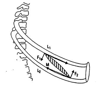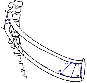 Горизонтальный размер грудной полости увеличивается в результате сокращения наружных межрёберных и межхрящевых мышц (инспираторных). Из-за косого направления волокон этих мышц, расстояние от места прикрепления рёбер к позвоночнику и хрящей к грудине до места прикрепления мышечных волокон к ним больше у нижних рёбер, чем у верхних (АО>ОВ, А1О1>В1О1). Поэтому момент силы, определяющий движение рычагов, оказывается большим у нижнего ребра и хряща. При спокойном дыхании возбуждаются и сокращаются только межхрящевые и межрёберные мышцы верхних 3-5 межреберных промежутков. В результате подъёма рёбер увеличивается смещение грудины вперёд и отклонение боковых частей рёбер в стороны.