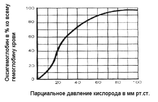 График, отражающий способность гемоглобина присоединять и отдавать кислород, - кривая диссоциации оксигемоглобина. По оси абсцисс на этом графике - количество оксигемоглобина в процентах ко всему гемоглобину крови, по оси ординат – напряжение кислорода в крови в мм рт. ст.