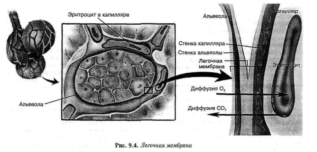 Газообмен между воздухом в альвеолах и кровью в легочных капиллярах осуществляется через легочную мембрану (альвеолярно-капиллярную мембрану). Состоит из альвеолярной стенки; капиллярной стенки и их базальных мембран. Различие парциальных давлений газов в альвеолах и в крови создает градиент давления через легочную мембрану. Это является основой для осуществления газообмена во время диффузии кислорода и углекислого газа.