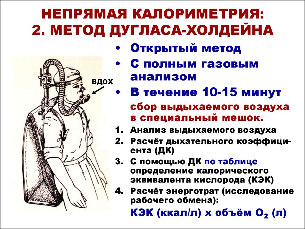 Наиболее распространен способ Дугласа-Холдейна, при котором в течение 10-15 мин собирают выдыхаемый воздух в мешок из воздухонепроницаемой ткани (мешок Дугласа), укрепляемый на спине обследуемого. Он дышит через загубник, взятый в рот, или резиновую маску, надетую на лицо. В загубнике и маске имеются клапаны, устроенные так, что обследуемый свободно вдыхает атмосферный воздух, а выдыхает воздух в мешок Дугласа. Когда мешок наполнен, измеряют объем выдохнутого воздуха, в котором определяют количество О2 и СО2.