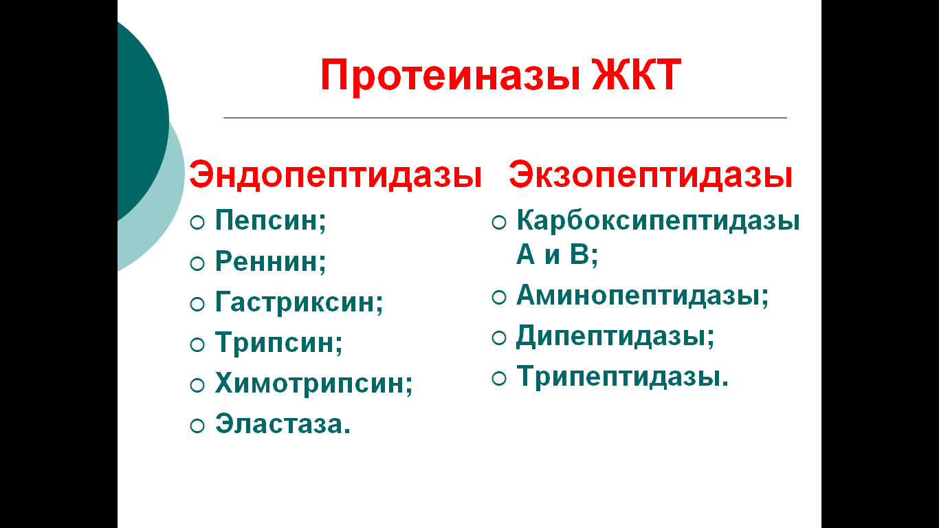 Переваривание происходит под действием протеаз - пептидгидролаз. Протеазы, гидролизирующие пептидные связи внутри молекулы - эндопептидазы, концевые аминокислоты - экзопептидазы.