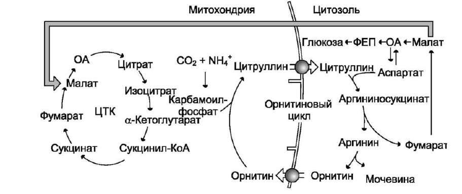 Фумарат, образующийся в результате расщепления аргининосукцината, превращается в малат, который затем переносится в митохондрии, включается в ЦТК и дегидрируется с образованием оксалоацетата. Эта реакция сопровождается выделением 3 молекул АТФ, которые и компенсируют затраты энергии на синтез одной молекулы мочевины.