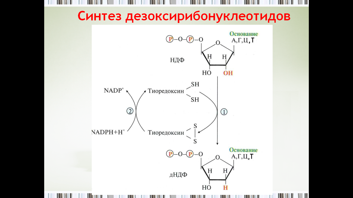 Реакцию восстановления НДФ в дезокси-про-изводные катализирует рибонуклеотидредуктаз-ный комплекс, в состав которого входят: собственно рибонуклеотидредуктаза (РНР), белок тиоредоксин и фермент тиоредоксинредуктаза, обеспечивающий регенерацию восстановленной формы тиоредоксина Рибонуклеотидредуктаза - олигомерный белок, состоящий из двух В1- и двух В2-субъеди-ниц, и содержит негеминовое железо в качестве кофактора.