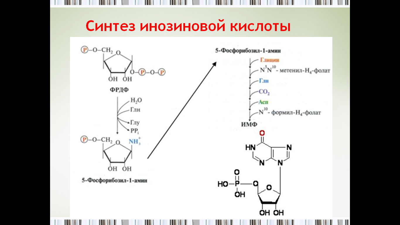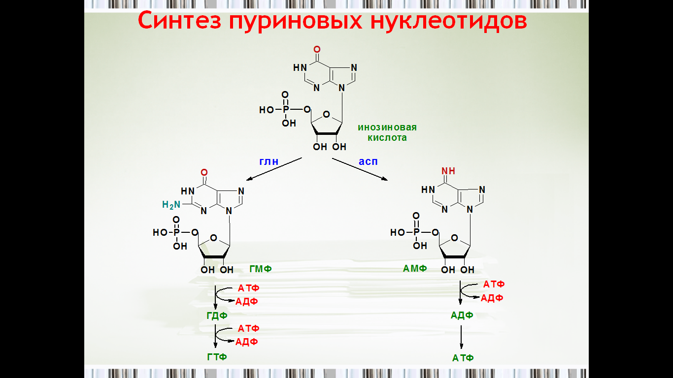 Образование пуриновых нуклеотидов (адениловой и гуаниловой кислот, АМФ и ГМФ) осуществляется из инозиновой кислоты (ИМФ). Причем в синтезе обоих мононуклеотидов участвуют по два фермента, отличных по своему механизму действия. Образование ГМФ из ИМФ катализируют ИМФ-дегидрогеназа и ГМФ-синтетаза, а образование АМФ из того же предшественника катализируется последовательным действием аденилосукцинатсинтетазы и аденилосукцинатлиазы.