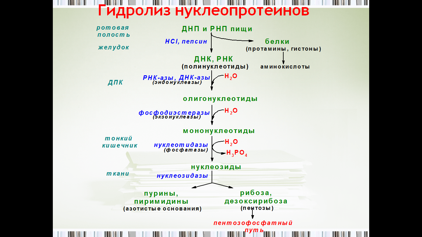 Схема говорит о многом. Съели курочку, её надо разобрать. ДНП и РНП чрез пищевод попадает в желудок, там, под действием агрессивных агентов - соляной кислоты и пепсинов расщепляются до полинуклеотидов. Дальше в ход вступают эндонуклеазы, образуются олигонуклеотиды и экзонуклеазы, ура, получили мононуклеотиды.