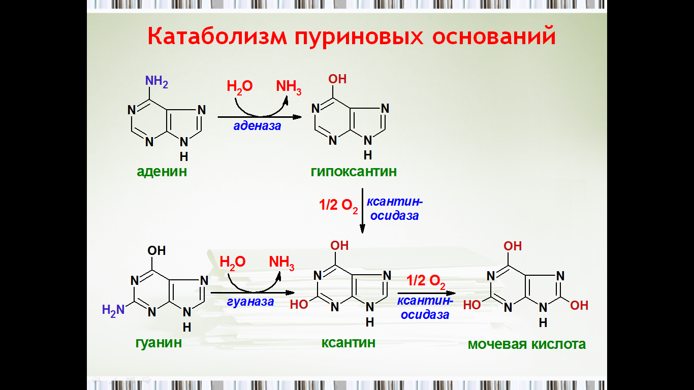 Ксантин является непосредственным предшественником мочевой кислоты. Он образуется из некоторых пуринов, в то время как гипоксантин относится к промежуточным продуктам. Окисление гппоксантипа в ксантин, а последнего в мочевую кислоту опосредуется ксантиноксидазой, выявленной в печени и слизистой оболочке кишечника.