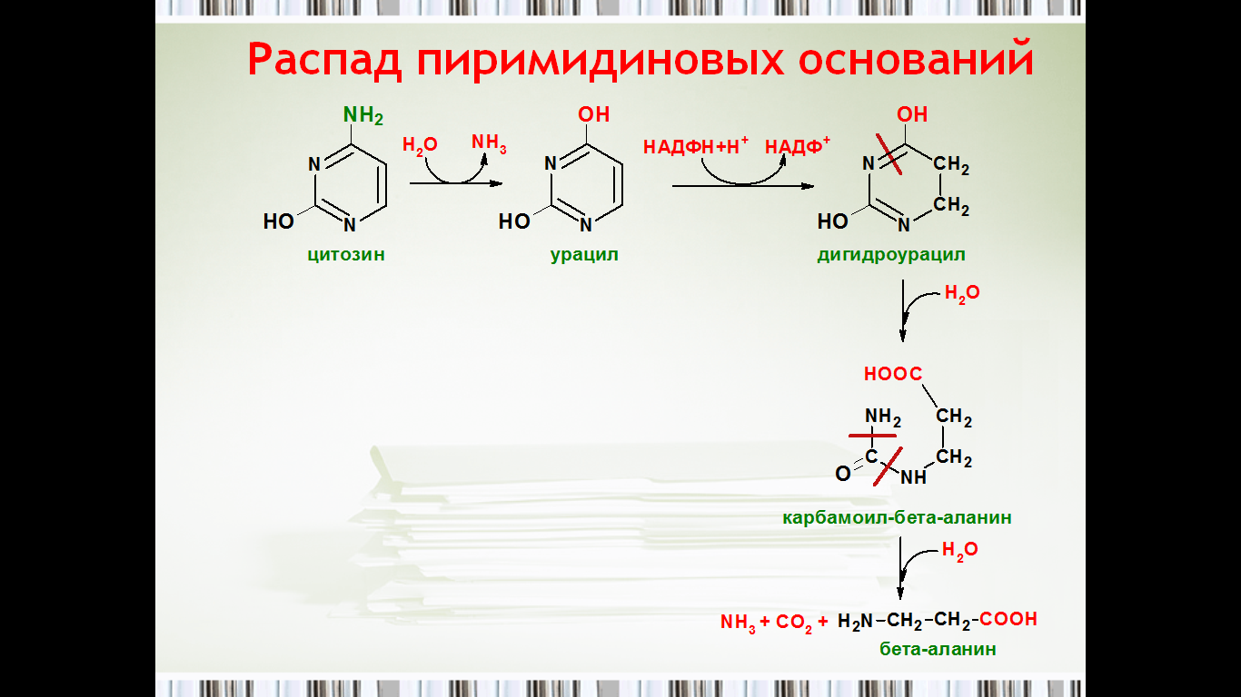 Это единственное нарушение синтеза пирими-динов de novo. Оно вызвано снижением активности УМФ-синтазы, которая катализирует образование и декарбоксилирование ОМФ. Поскольку в эмбриогенезе от образования пиримидинов de novo зависит обеспечение синтеза ДНК субстратами, то жизнь плода невозможна при полном отсутствии активности этого фермента. Действительно, у всех пациентов с оротацидурией отмечают заметную, хотя и очень низкую активность УМФ-синтазы. Установлено, что содержание оротовой кислоты в моче пациентов (1 г/сут и более) значительно превосходит количество оротата, которое ежедневно синтезируется в норме (около 600 мг/сут). Снижение синтеза пирими-диновых нуклеотидов, наблюдающееся при этой патологии, нарушает регуляцию КАД-фермента по механизму ретроингибирования, из-за чего возникает гиперпродукция оротата.