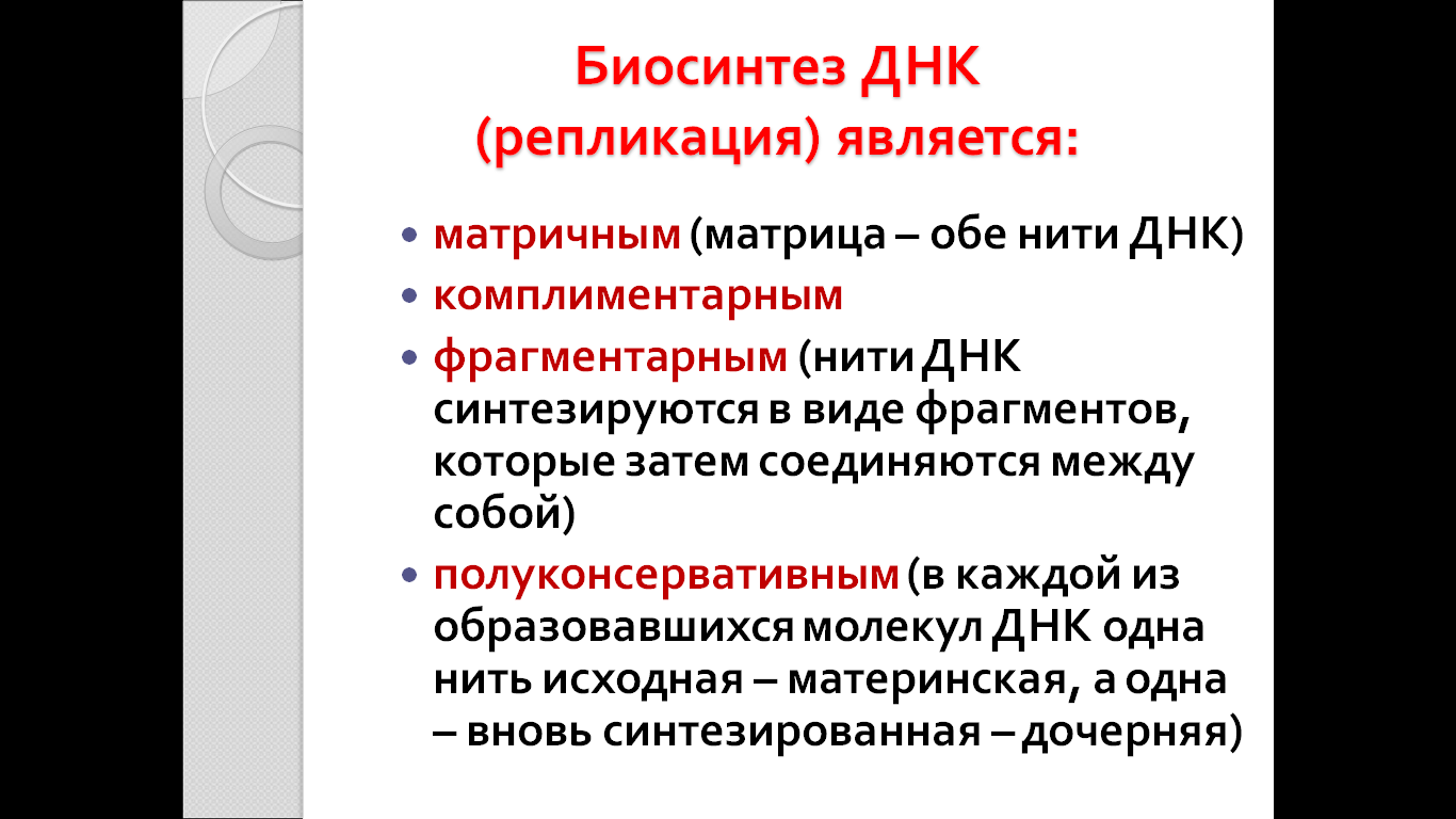 Репликация ДНК осуществляется ДНК-зависимыми ДНК-полимеразами. Субстратами и источниками энергии для синтеза продукта служат 4 макроэргических соединения - дезоксирибонуклеозидтрифосфаты: дАТФ, дГТФ, дЦТФ и дТТФ, для активации которых необходимы ионы магния. Нейтрализуя отрицательный заряд нуклеотидов, они повышают их реакционную способность. Ферменты проявляют каталитическую активность только в присутствии предварительно раскрученной матричной двухцепочечной ДНК. Синтез цепей ДНК происходит в направлении 5'-3' растущей цепи, т.е. очередной нуклеотид присоединяется к свободному З'-ОН-концу предшествующего нуклеотидного остатка. Синтезируемая цепь всегда антипараллельна матричной цепи. В ходе репликации образуются 2 дочерние цепи, представляющие собой копии матричных цепей.