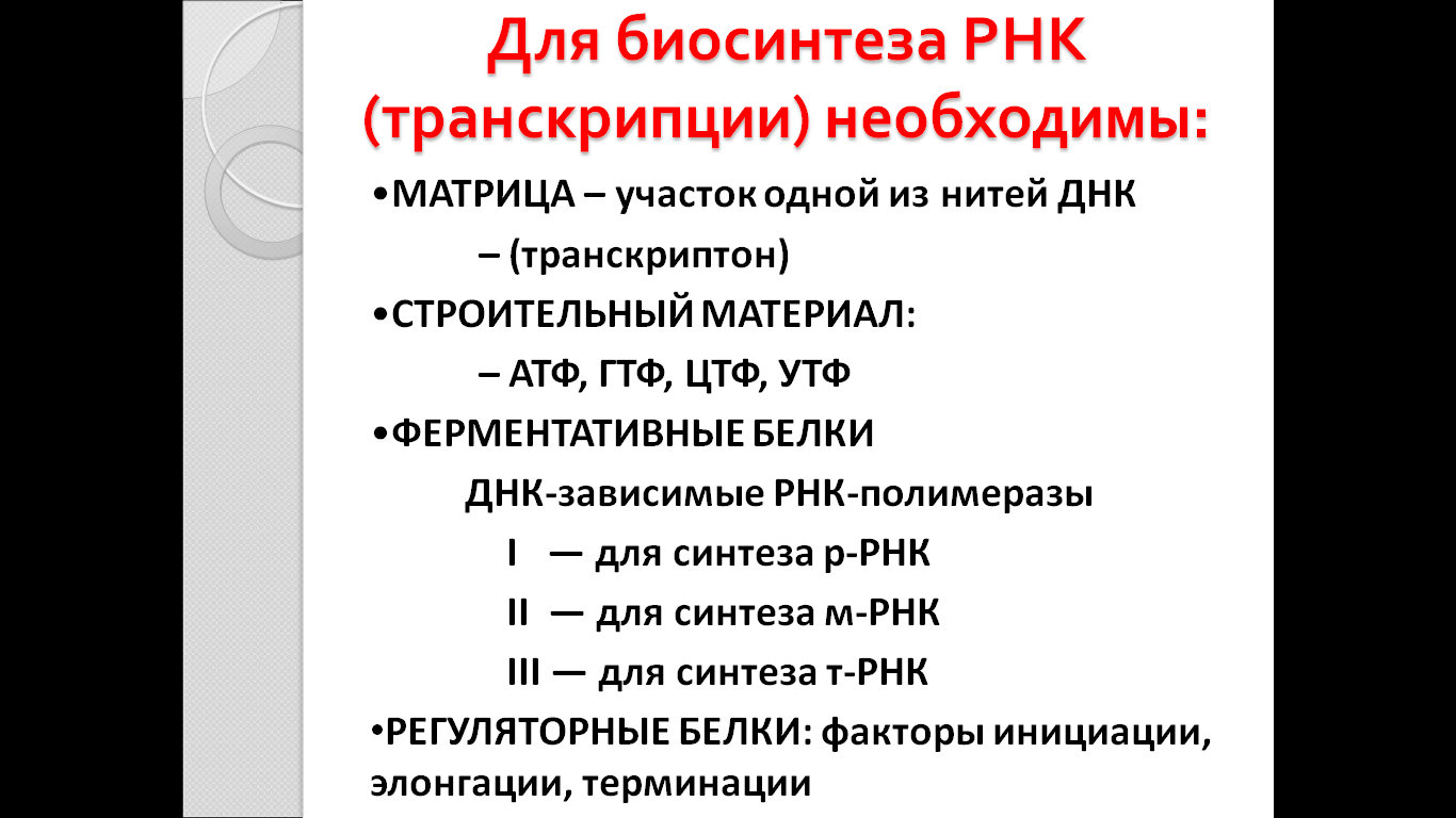 Транскрипцией называется синтез РНК на ДНК-матрице. В результате образуются первичные траскрипты мРНК, тРНК, рРНК, комплементарные матричной цепи ДНК, имеющей направление от 3'-, к 5'-концу. Субстратами и источниками энергии для синтеза РНК являются рибонуклеозидтрифосфаты ( НТФ: АТФ, ГТФ, ЦТФ, УТФ).