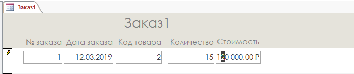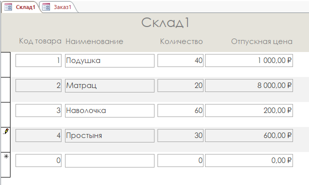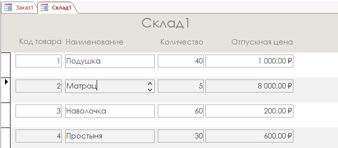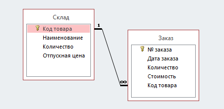 В таблице склад содержится информация о товарах. В таблице заказ информация о товарах, отгруженных со склада. Они соединены связью Один-ко-Многим по полям Код товара. Сразу создаю формы для этих таблиц.