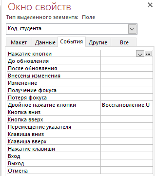 для поля Код студента, Свойства, вкладка События, Двойное нажатие кнопки – Восстановление. U