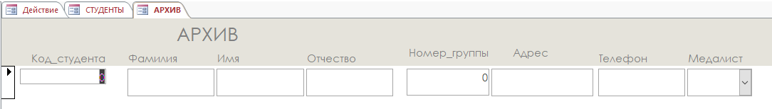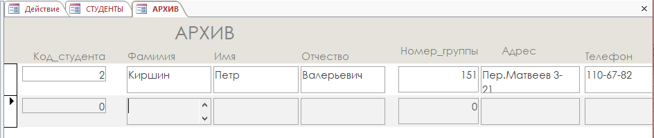 «Добавление_в_архив» (Из таблицы Студенты в таблицу Архив). Условие отбора: Код студента: [Forms]![СТУДЕНТЫ]![Код студента]. Команда ДОБАВЛЕНИЕ.