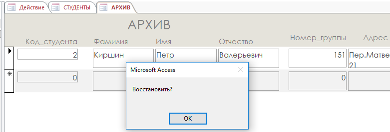 «Удаление_из_архива». Условия отбора для поля «Код_студента»: [Forms]![Архив]![Код_студента]