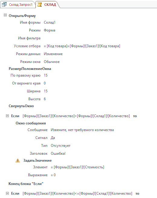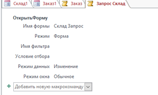 Создаю форму Склад Запрос1 и на его основе макрос Запрос Склад, который будет открывать эту форму.