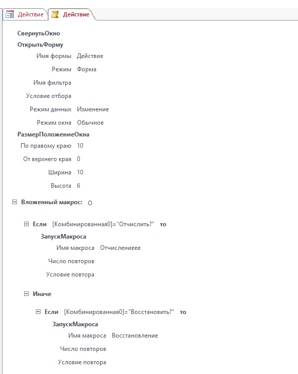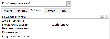 Для выполнения макроса «Действие. О». В форме «Действие» в режиме конструктора, В Свойствах, во вкладке События, Поле обновления - Действие. О.